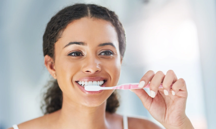 Gently brush implants with a soft-bristle toothbrush and non-abrasive toothpaste. Clean delicately around crowns and gum lines. Good brushing reduces plaque and bacterial buildup.